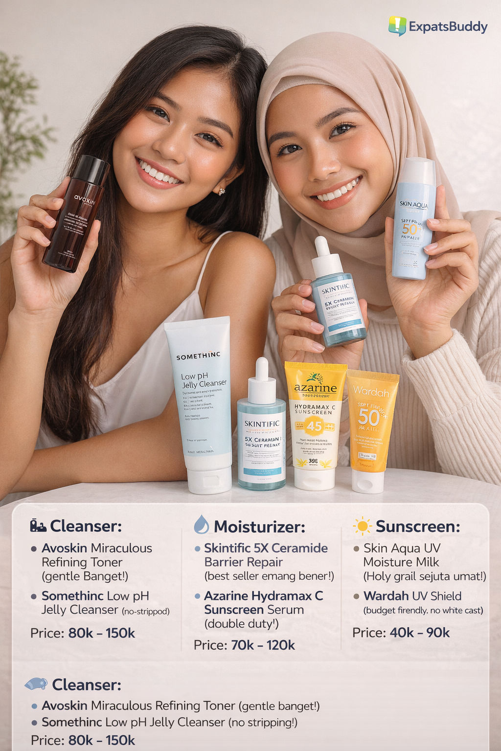 AM: Gentle cleanser โ Toner โ Moisturizer โ Sunscreen (WAJIB!)
